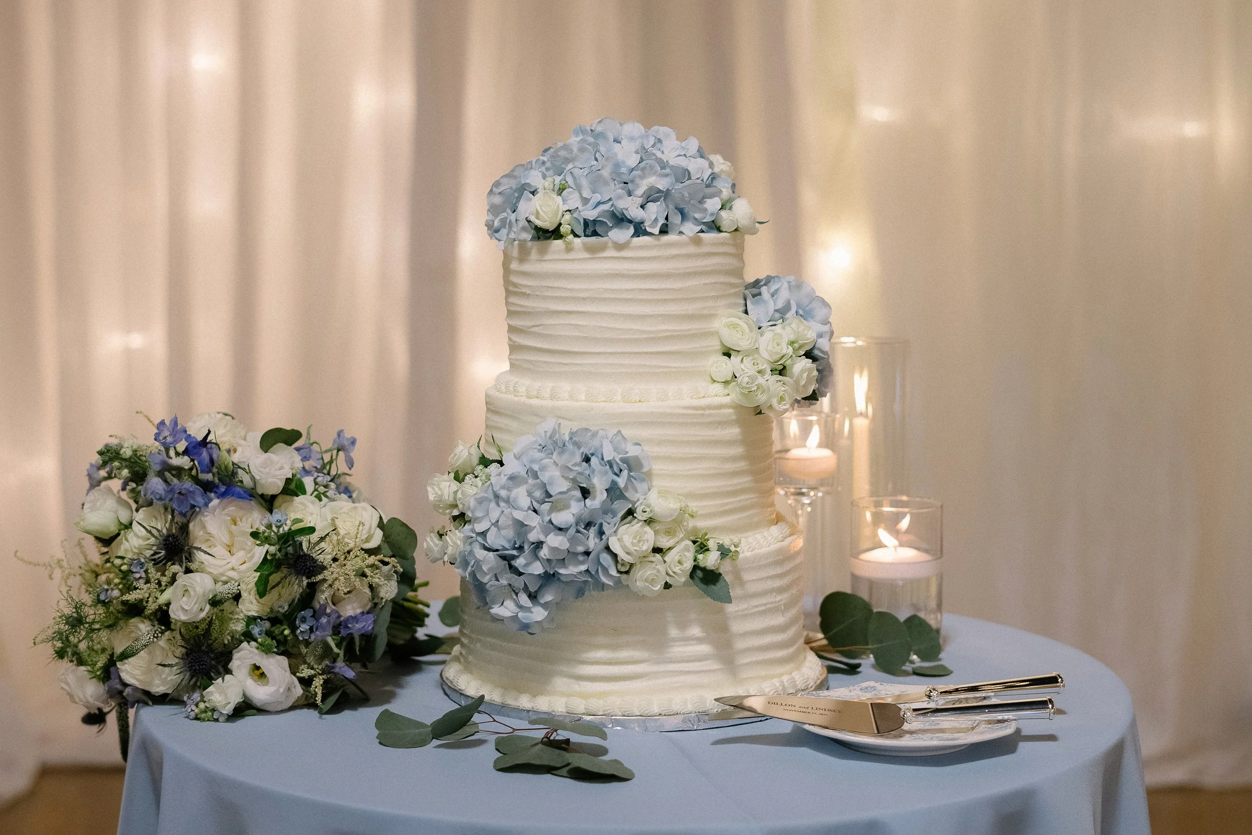 From there, the celebration continued at Venue 650, where every detail of the reception had been thoughtfully brought to life by Maggie Jane Events. A soft palette of white and light blue set the tone, classic, refined, and effortlessly elegant.